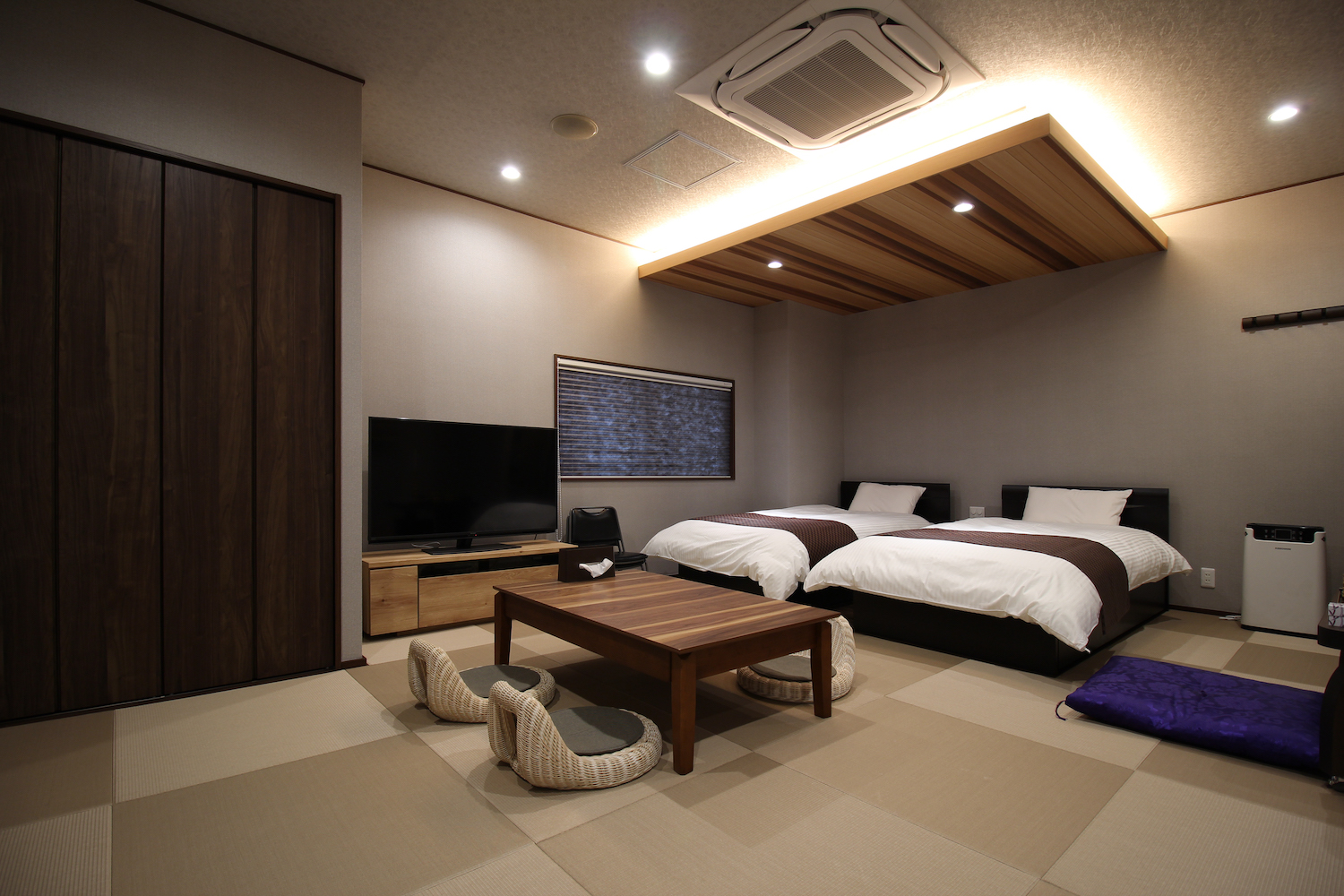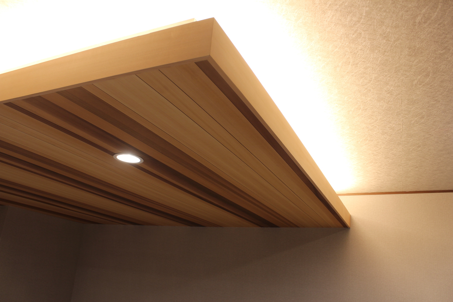 くつろぎと落ち着きのある空間に。落ち着いた雰囲気を演出する為、色目をブラウン系統でまとめました。天井を一段下げ、仕上げ材料も変える事で見えない区画を設けました。一段下げた部分には間接照明を設置。柔らかい雰囲気を演出しています。